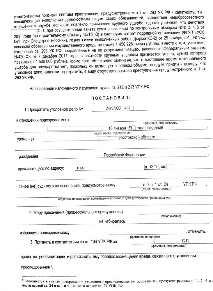 Прекращение уголовного дела в отношении обвиняемого в совершении преступлений предусмотренных ччасти.1 ст.285 (Злоупотребление должностными полномочиями) и ч.1 ст.293 УК РФ (Халатность)